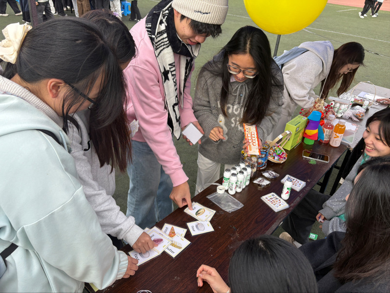 活动现场热闹非凡,同学们精心设计的两个游戏吸引了众多同学驻足参与。在“食卡同心竞逐”环节,选手们两两结对,在卡片竞技中展现了非凡反应力;而“美食拼搭互助”则考验了大家的协作精神,同学们分工明确、互相指引,共同完成了一件件拼图作品。现场欢笑声、助威声此起彼伏,处处传递着共同闯关的喜悦。